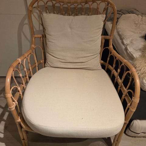 Smuk og stilren lænestol i naturmateriale sælges. Stolen har et let og hyggeligt udtryk og passer perfekt ind i både stue, soveværelse, udestue eller sommerhus.