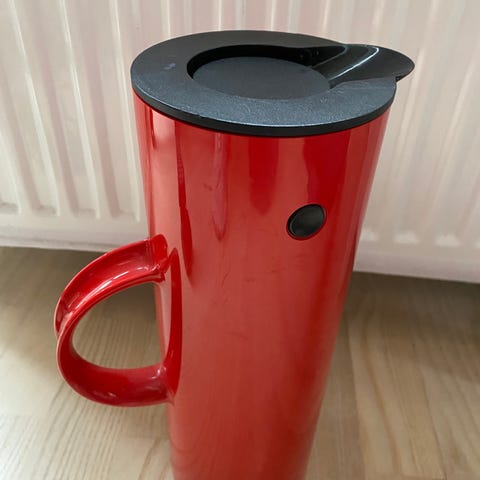 Stelton termokande med hvid krop og sort låg og håndtag. Designet til at holde drikkevarer varme eller kolde i længere tid.