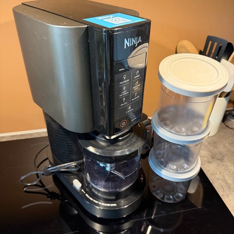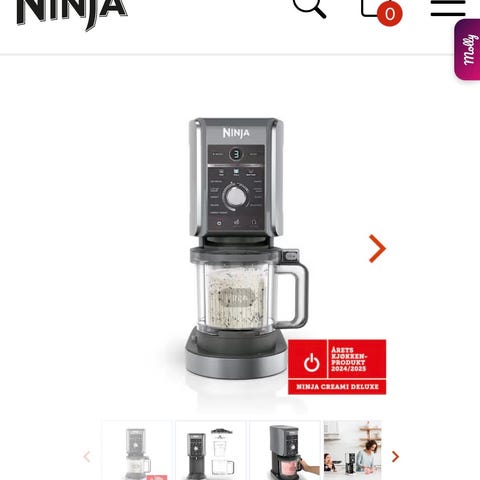 Ninja Advanced Creamy Technology ismaskine med flere funktioner som is, sorbet, gelato og frosne drikke. Maskinen har en sort og sølvfarvet krop med et brugervenligt kontrolpanel og drejeknap til valg af funktioner. Den leveres med gennemsigtige beholdere til isfremstilling.
