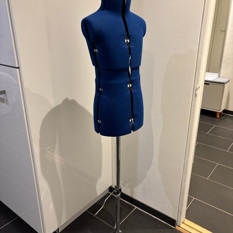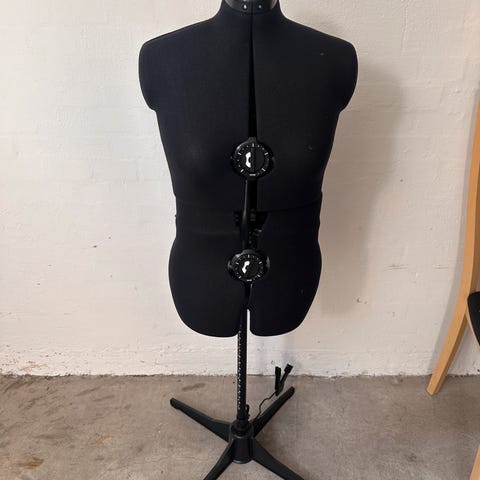Sort kvindelig skrædderdukke med sølvfarvet metalfod. Dukken er designet til beklædningsfremstilling og tilpasning, velegnet til brug i sy- og designarbejde.
