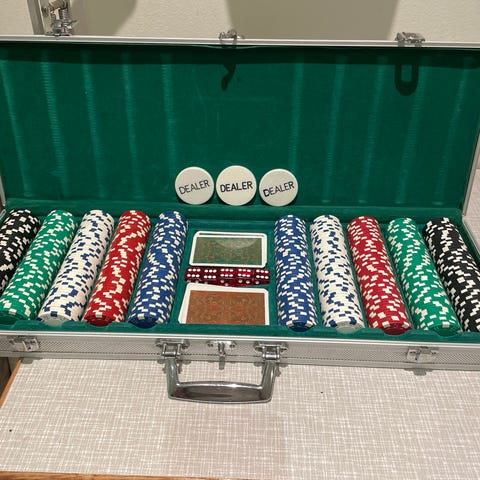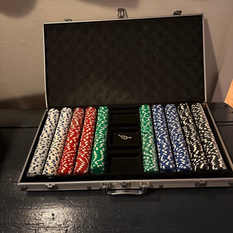 Pokerchips sæt med forskellige farver chips og en aluminium kuffert til opbevaring. Sættet indeholder grønne, blå, røde, hvide og sorte chips samt to kortspil og dealer knap. Kufferten har håndtag og låse for sikker transport og opbevaring.