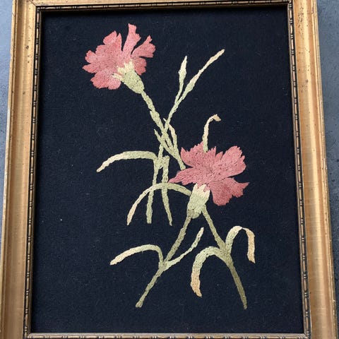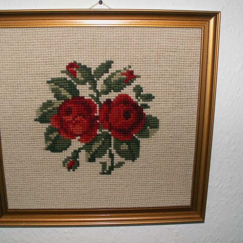 Fin ældre broderi i forgyldt træramme og bag glas. Rammen og broderi har patina men er stadig pæn og hel. 23x22cm