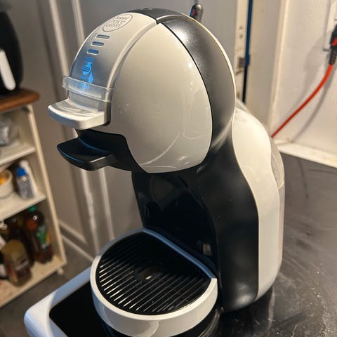 Krups Nescafe Dolce Gusto Piccolo kaffemaskine i hvid farve. Kaffemaskinen har et rundt design og leveres med aftagelige dele til brygning og opsamling af kaffe. Den er elektrisk drevet med tilslutningskabel og stik. Velegnet til brygning af kapselkaffe. Den har aldrig været brugt og ved strømtilslutning ser den ud til at fungere.. Helt som ny.