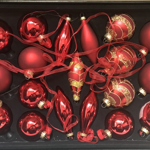 Alle kugler er røde og med bånd, i forskellige størrelser og overflader
