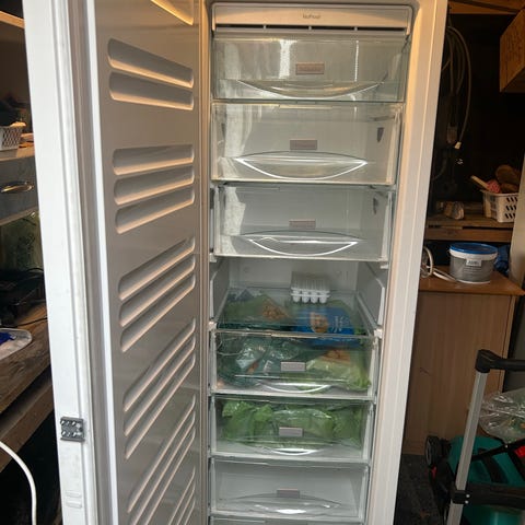 Et Miele fryseskab, som har kørt helt perfekt, men vi har ikke plads til det længere. Der er monteret børnesikring på lågen. Skåbslågen har en bule, hvor malingen er skallet af, men det er kun kosmetisk.
