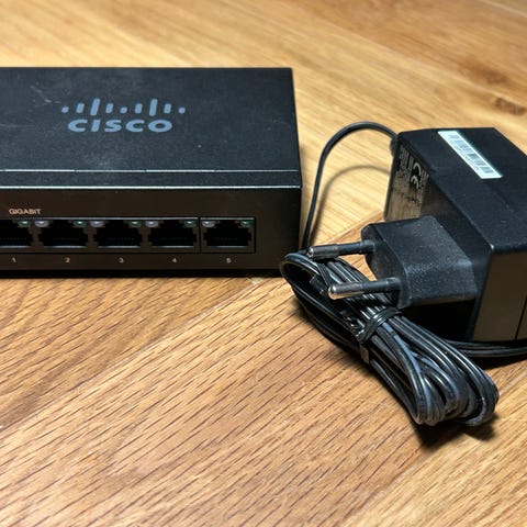 Cisco SG110D-05 5-Port Gigabit Desktop Netværksswitch. En netværksswitch med fem porte,