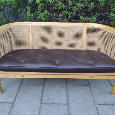 Fritstående bananformet 3-personers sofa. Model 62/'Geisha'. Fuldt polstret med uld, søm og skrå ben i massivt teaktræ. Fremstillet hos Møbelfabrikken Kronen. L. 230 cm, H. 75 cm, D. ca. 80 cm.