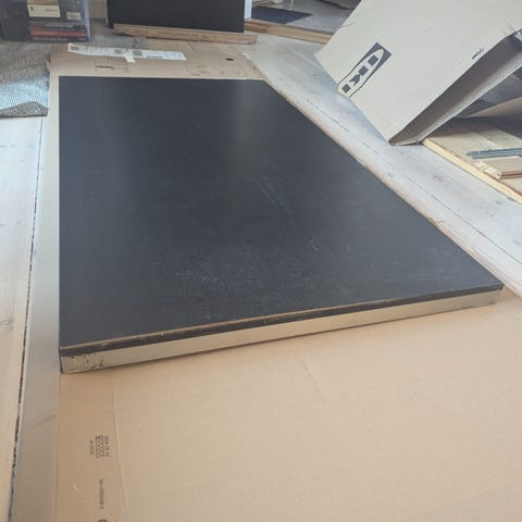Afskæring af helt ny bordplade. Den ene ende har spor efter afskæring, men skal blot slibes let.