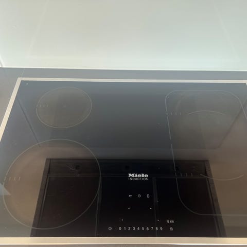 Miele 60cm induktionskogeplade med sort glasoverflade og metalramme. Kogepladen har flere kogezoner og er designet til effektiv og præcis varmefordeling ved madlavning.