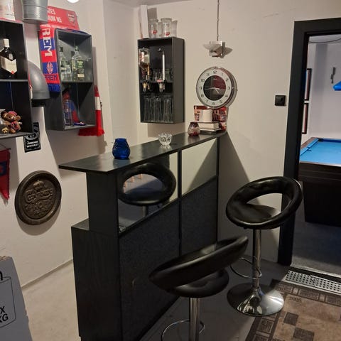 Barbord med fire barstole og spejl. Møblet er sort og designet til brug i hjem eller barområde. Barstolene har rundt sæde og fodstøtte.