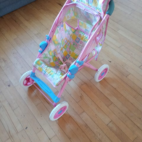 Baby Born dukkevogn til børn med pink og mønstret stof, metalramme og hjul. Egnet til leg og transport af dukker.