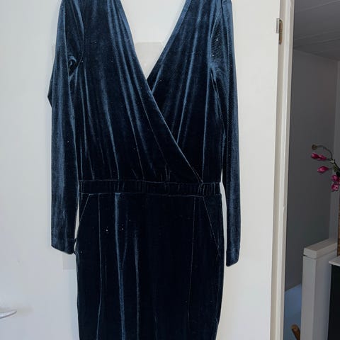 Lang kjole med perlebesætning på overdel,korte ærmer og slids bagpå.