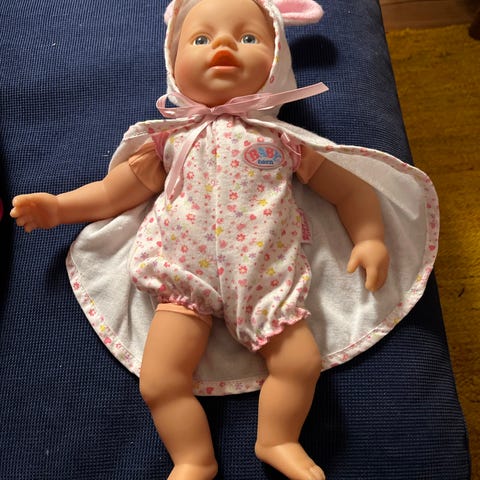 Little Treasure Dukke iført lyserødt tøj med blomsterprint. Dukken leveres med hvid hagesmæk, lyserød hue, sut og en sutteflaske som tilbehør. Egnet til børn fra 18 måneder og op.