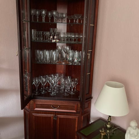 Ældre, i to dele, øverste skab med fine glasruder, begge skabe med lås.