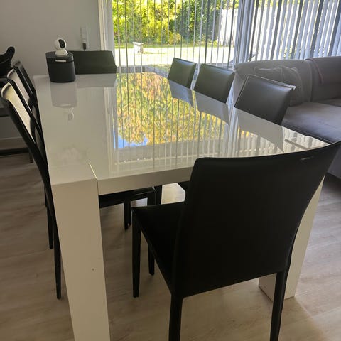 Spisebord med 6 stole I god stand. Der er 2 tilægsplader til bordet. Stole og Spisebord sælges kun samlet for 800 kr. Spisebordet er 239 cm.langt med tilægsplader og 160 cm langt uden tillægsplader det er 90 cm. Bredt og 75 cm. Højt. Preben genbrugsshop-Nakskov. Lolland Falster.
