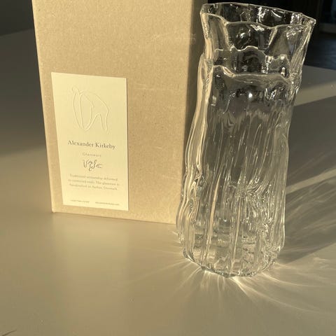 Mundblæst vase i klart glas med bølget kant og struktureret overflade. Vasen har en dekorativ form, ca 24 cm høj Diameter 9 cm i toppen, 10 cm på bredeste sted.