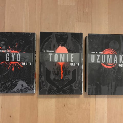 Junji Ito Gyo tegneserie med sort cover og illustreret indhold. Indeholder horror-tema og detaljerede tegninger. Sproget er engelsk.