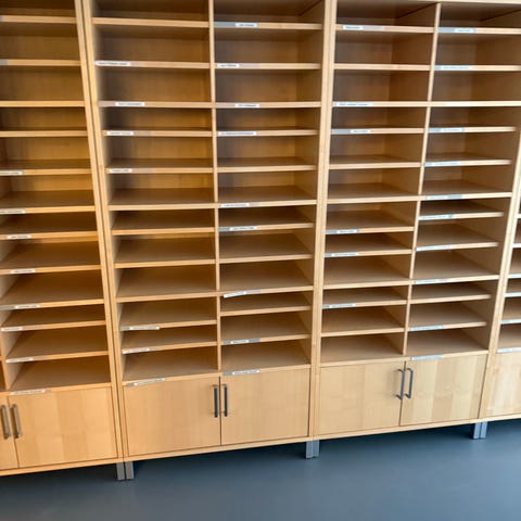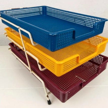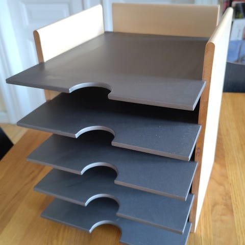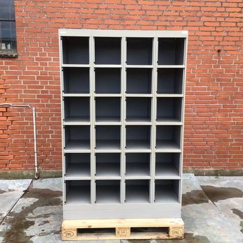 Gammel dueslag, brevholdet, arkivhylder i lille reol i teaktræ.