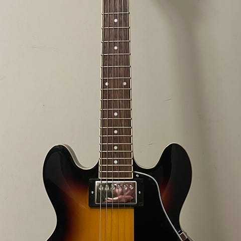Epiphone Casino 1967 Halvakustisk guitar i naturfarvet finish. Guitaren har en hollow body med to pickups P90 og justerbare kontrolknapper. Den er udstyret med en tremolo-arm og har en træbro med Epiphone-logo. Instrumentet er egnet til forskellige musikgenrer og tilbyder en kombination af akustisk resonans og elektrisk forstærkning.