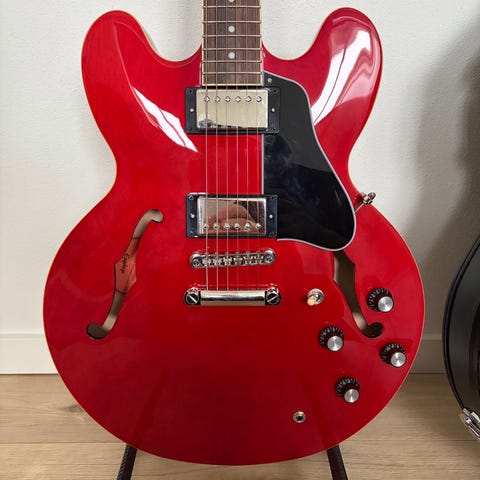 Epiphone Casino 1967 Halvakustisk guitar i naturfarvet finish. Guitaren har en hollow body med to pickups P90 og justerbare kontrolknapper. Den er udstyret med en tremolo-arm og har en træbro med Epiphone-logo. Instrumentet er egnet til forskellige musikgenrer og tilbyder en kombination af akustisk resonans og elektrisk forstærkning. Gibson, Rickenbacker, Fender, gretsch, Yamaha etc…