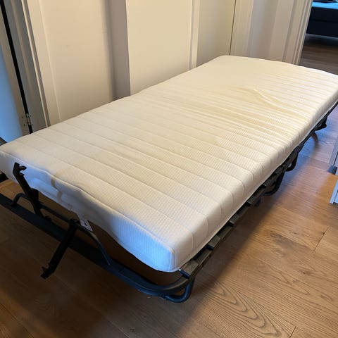 Sengen er brugt et par gange så i en virkelig fin stand. Dem måler 90x200cm og har en 11 cm tyk madras. Madrassen består af skum og memory foam.