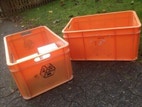 Andre samleobjekter, FDB kasse, Gamle FDB kasser i orange plastik med brugsspor. Et hjørne er hakket af på den ene.