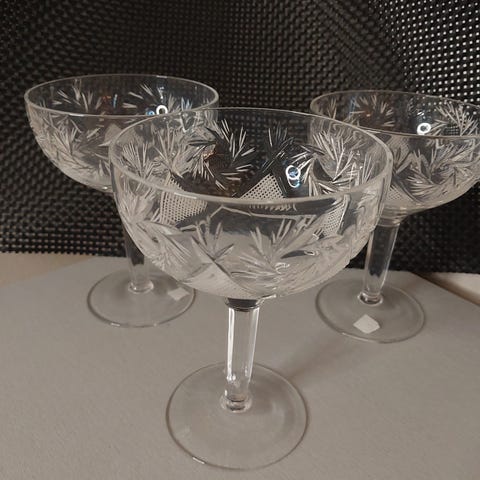 Franske champagneskåle, højde 13 cm, Ø 9,5 cm, 6 stk i perfekt stand. Kan også bruges til dessert eller cocktails. Pris kr 50/stk afhentet Kbh Ø. Forsendelse kr 50