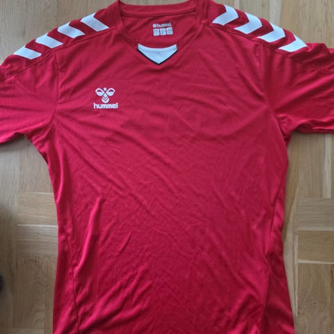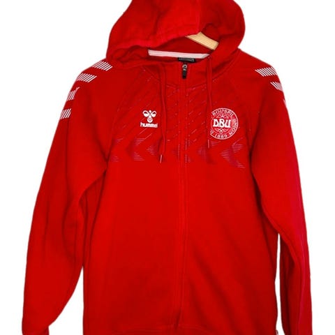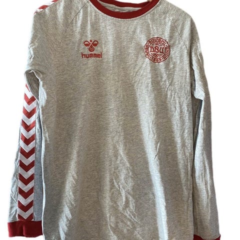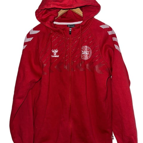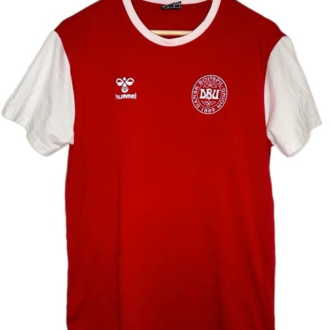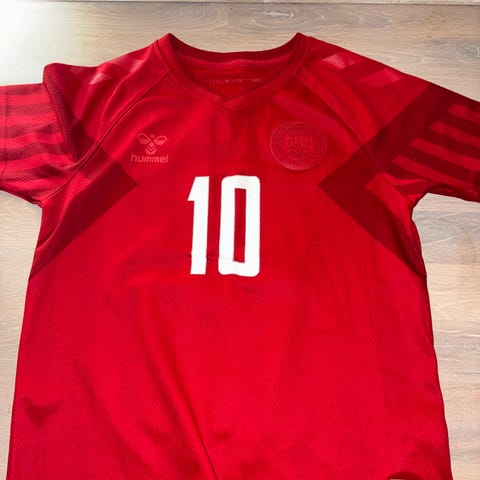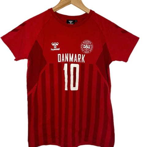 H&M Danmark fodboldtrøje i rød farve, størrelse 146/152. Fremstillet i polyester materiale. Trøjen har nummer 10 trykt på både front og ryg samt Danmarks fodboldlogo på brystet.