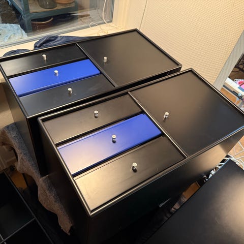 Sort opbevaringsskab med flere skuffer og hylder. Skabet har en enkel og funktionel opbygning med både låger og skuffer, der giver mulighed for organiseret opbevaring. Materialet er ikke specificeret, men skabet har en sort finish. Velegnet til opbevaring i hjemmet eller kontormiljøer.