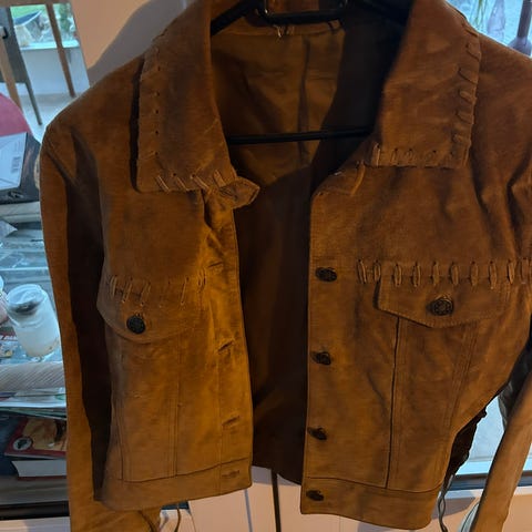 Postkasserød ruskindsjakke med rødt foer str. 36 mrk. WEARHOUSE. Hel og pæn
