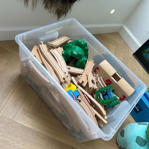 Årets julegave: Stor kasse med BRIO. Togbane legetøj bestående af forskellige træskinner, kurver og tilbehør til opbygning af togbaner. Materialet er træ og plastik. Sættet indeholder flere dele i forskellige størrelser og former til leg og kreativ sammensætning.