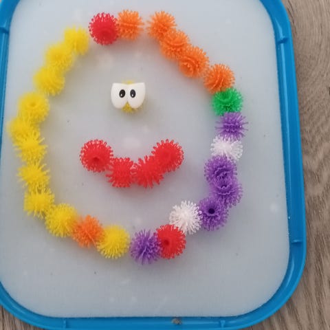 Sættet indeholder farverige Bunchems-kugler med små kroge, der klæber til hinanden og til den medfølgende overflade.