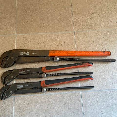 Et godt sæt 1 tomme rørtænger, 1 med smalt hoved til bøjninger/pibehoveder, samt 1 større vandpumpetang (papegøje-tang). Perfekt sæt til det meste VVS. Nypris 1500+ Er selv VVS’er, så spørg endelig for råd/arbejde etc.