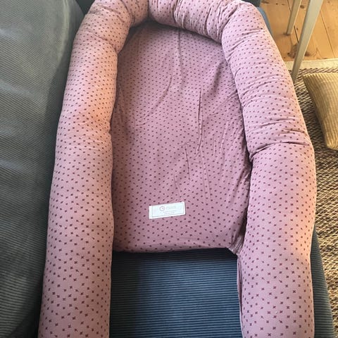 Babynest i grå og hvid med polstret Kaopok kant og Kaopok indvendig madras (allergi og økologisk). Designet til at give en tryg og komfortabel soveplads til baby. Kan bruges til at placere baby sikkert i seng eller på gulv. Der er plade og pose med til at kunne bære baby.