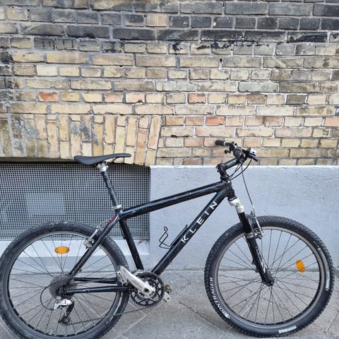 Fra 1997. Rock Shox Judy forgaffel. Shimano XTR, DT fornav og Tune bagnav med titaniums eger på Mavic ceramic fælg. Desværre har navet en reparation og bagfælgen små revner ved niplerne, så kan kun bruges til grus stier og bykørsel. Richey sadelpind og Flite titanium sadel. MC3 frempind som mangler noget af det originale headset. Stellet har lidt buler på overrøret og lidt hakker hist og her men ellers flot og uden bobler. Fantastisk lakering som ose af det fedeste fra 90erne. Vil nok passe bedste til en person mellem 175 og 185. Sælges uden pedaler
