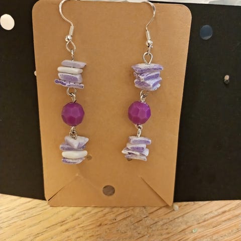 Flotte øreringe lavet i forskellige lilla farver polymer ler som er hærdet i ovnen og derefter belagt med epoxy for at få et skinnende look på overfladen.