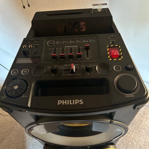 Philips NX4 højttalersystem med sort kabinet og guldfarvede elementer. Systemet inkluderer kontrolpanel med knapper og drejeknapper, NFC-funktion og forskellige tilslutningsmuligheder bagpå. Designet til lydafspilning i hjemmet.