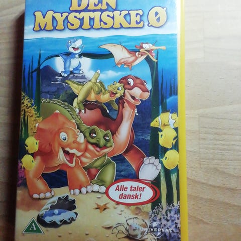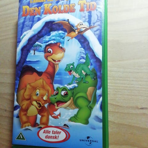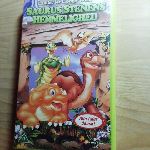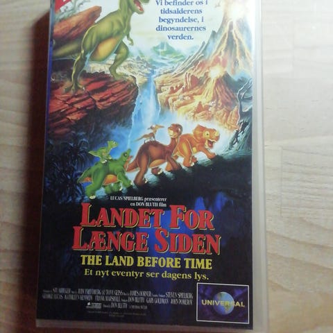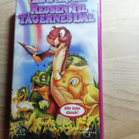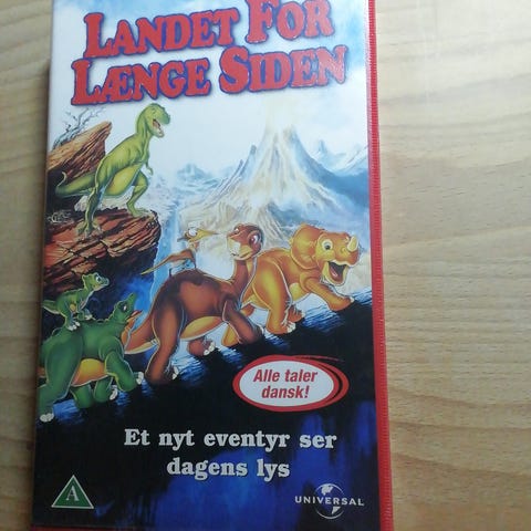 Land Before Time Rejsen Til Det Store Hav VHS børnefilm med dansk tale. Filmen fortæller historien om dinosauren Lillefod, der sammen med sine venner begiver sig ud på en rejse til Det Store Hav. VHS-kassette i standardformat med Universal logo.