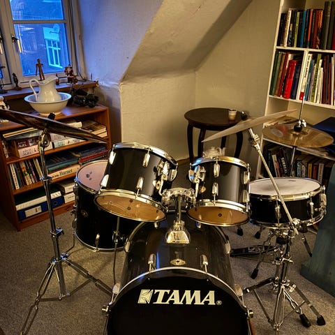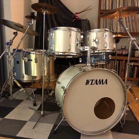 Tama cocktail trommesæt bestående af stortromme, lilletromme og to tom-tom. Sættet inkluderer stativer til trommerne og to tasker til opbevaring og transport.