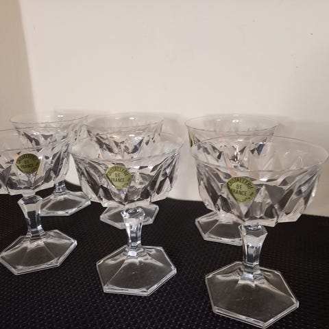 Smukke krystal champagneskåle, højde 13 cm, Ø 9,5 cm, 6 stk i perfekt stand. Kan også bruges til dessert og cocktails. Pris kr 50/stk afhentet Kbh Ø. Sikker forsendelse kr 50