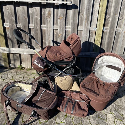 Pænt og velholdt sæt fra Emmaljunga. Med både lift, barnevogn og klapvogn i ét.