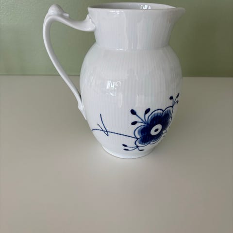 Royal Copenhagen Musselmalet Riflet kande med klassisk blå blomstermotiv på hvid porcelæn. Kanden har en traditionel form med hank og tud, velegnet til servering af væsker. Helt ny og i emballage, 70 cl