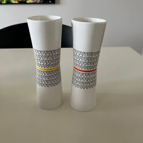 Et par smukke porcelænsvaser med mønster af hjerter. Design Mette Ditmar for Aida. “Heart” hedder de. Højde 17,5 cm. Flot brugt stand. Kr 250,/ for parret
