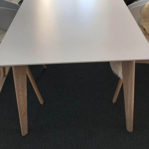Meget flot spisebord med to tillægsplader. Bordet måler 100x170 cm uden plader og 100x270 med plader. Et bord der skal ses. Passer ind i mange hjem.