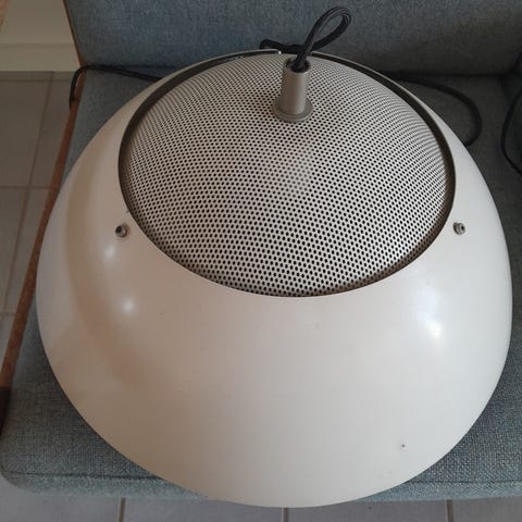 Pendel lampe hvidt og Mølgård. Safari fra 1981 Lampen har et karakteristisk design med flere lag skærme, der sikrer blændfri belysning. Egnet til ophæng i loftet og giver et diffust lys.