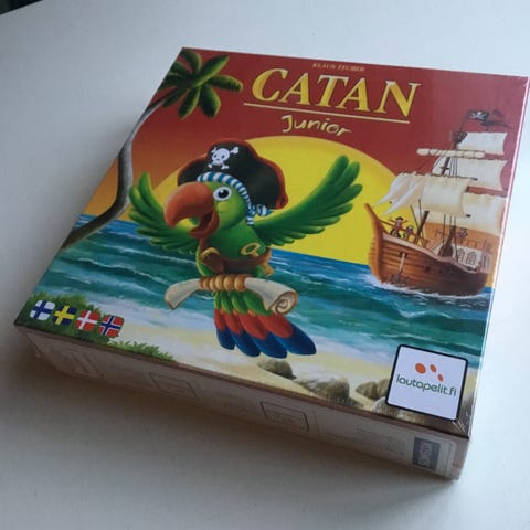 Catan Junior brætspil med pirattema, inklusiv spillebrikker, terninger og spilleplade. Spillet er designet til børn og indeholder elementer som skibe og pirater. Materialet består af pap og plastikdele.