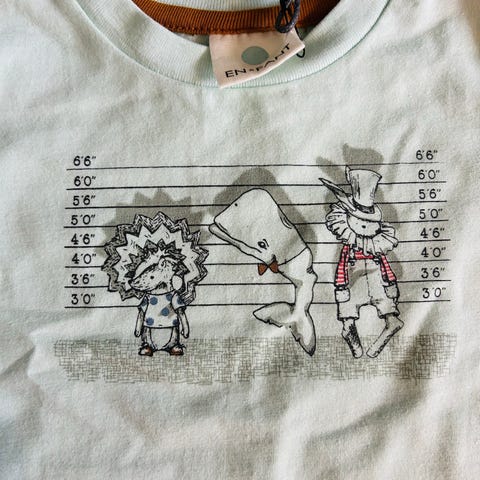 Grøn t-shirt med motiv af et næsehorn med kasket og sneaks. Lavet i 100% økologisk bomuld. Brugt, men fremstår i god stand.