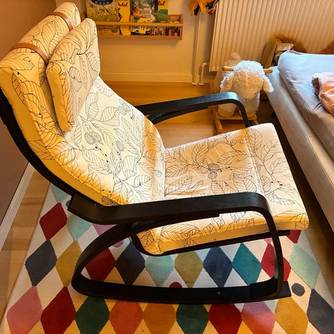 "Poäng" gyngestol sortbrun stel og mørkegrå "Skiftebo" hynde.