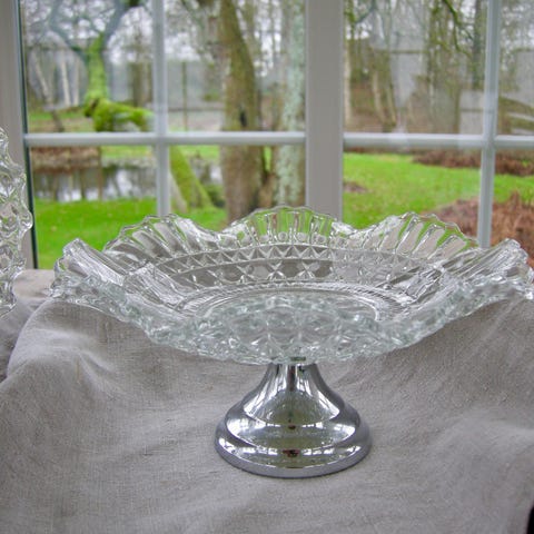 Vintage Visitkortskål i krystal med pressemønster og flæsekant.