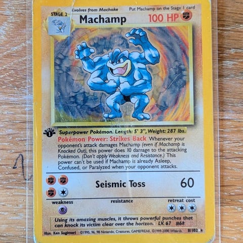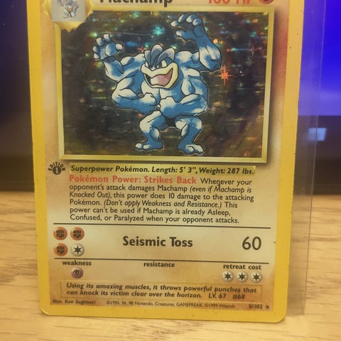 8/102, Machamp – Holo, fra Base Set: 1st Edition. Noget medtaget.